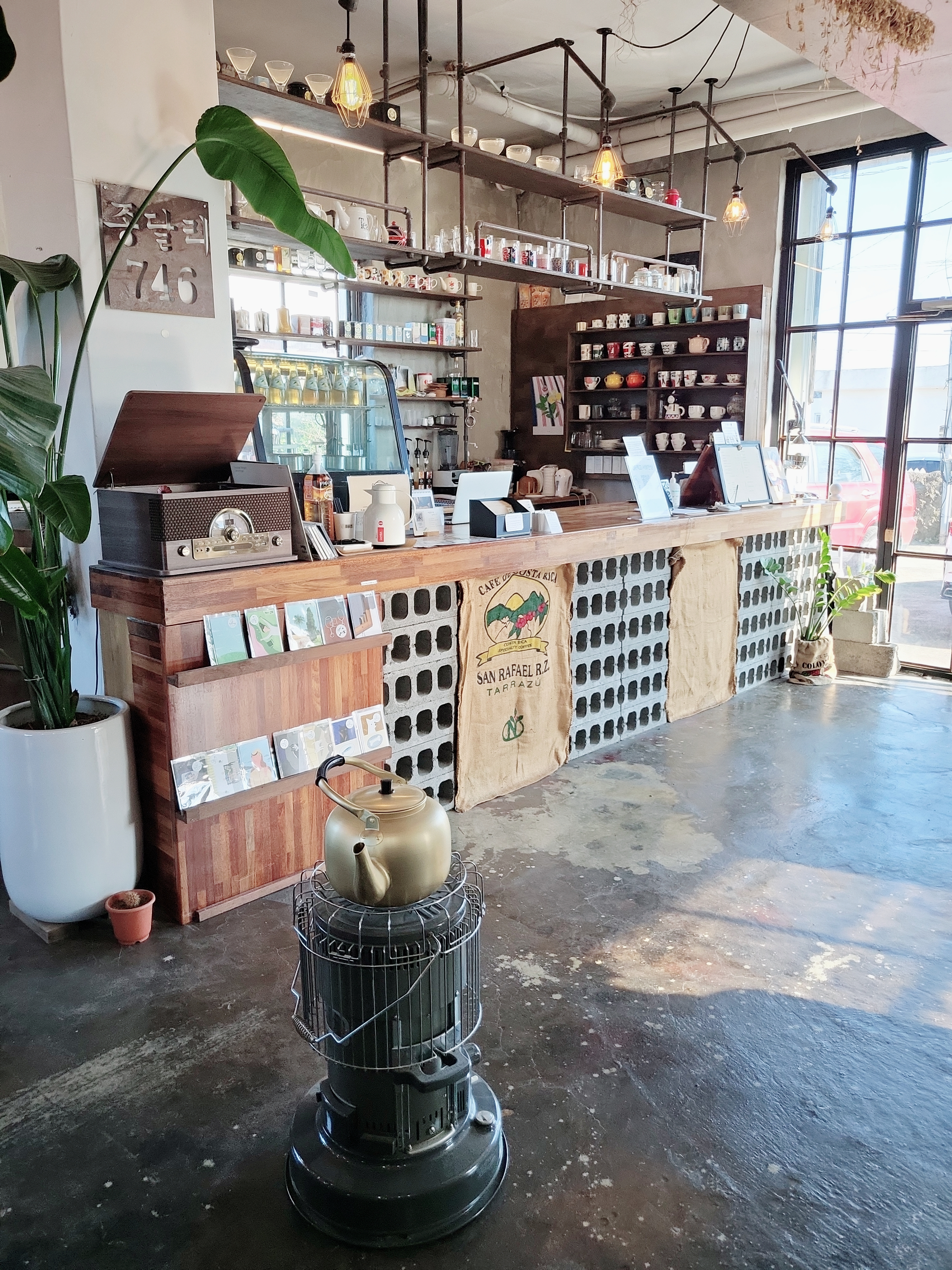 오른편으로는 창가를 바라보는 3인석 테이블1개 입식테이블 2개 정도가 놓여있다.