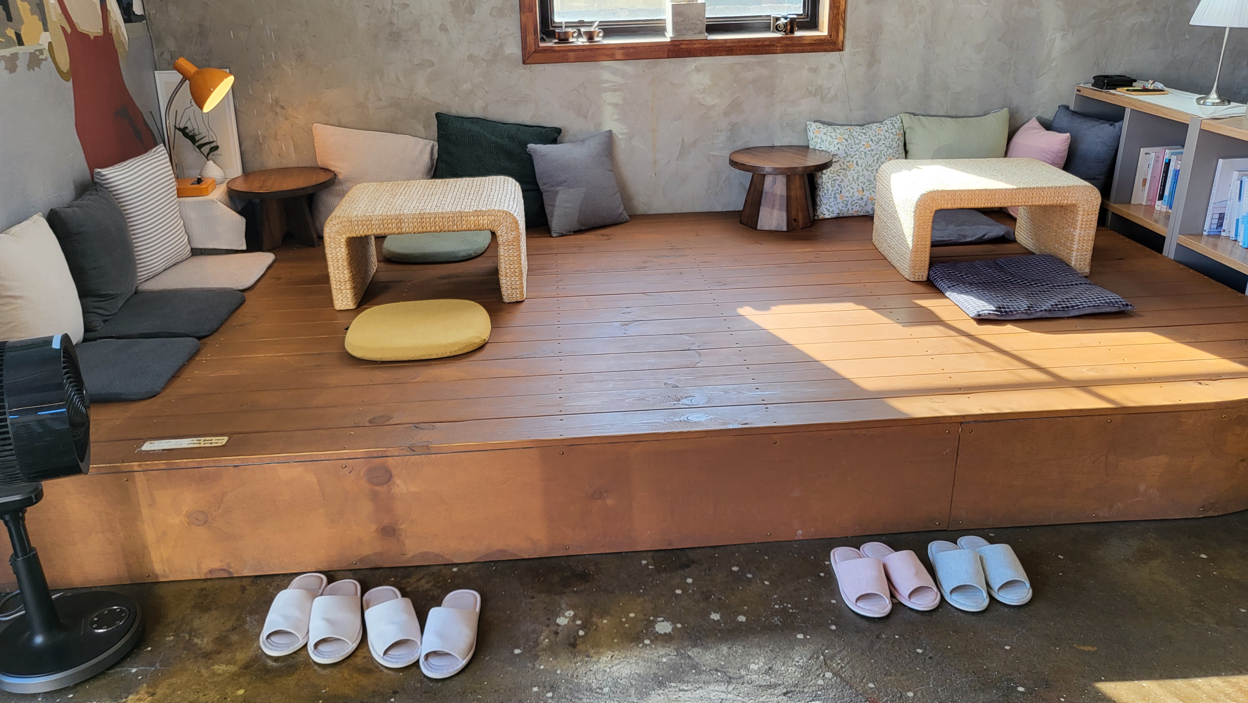 가운데에 6인석테이블 1개, 왼편으로 좌식테이블1개와 입식테이블 2개,