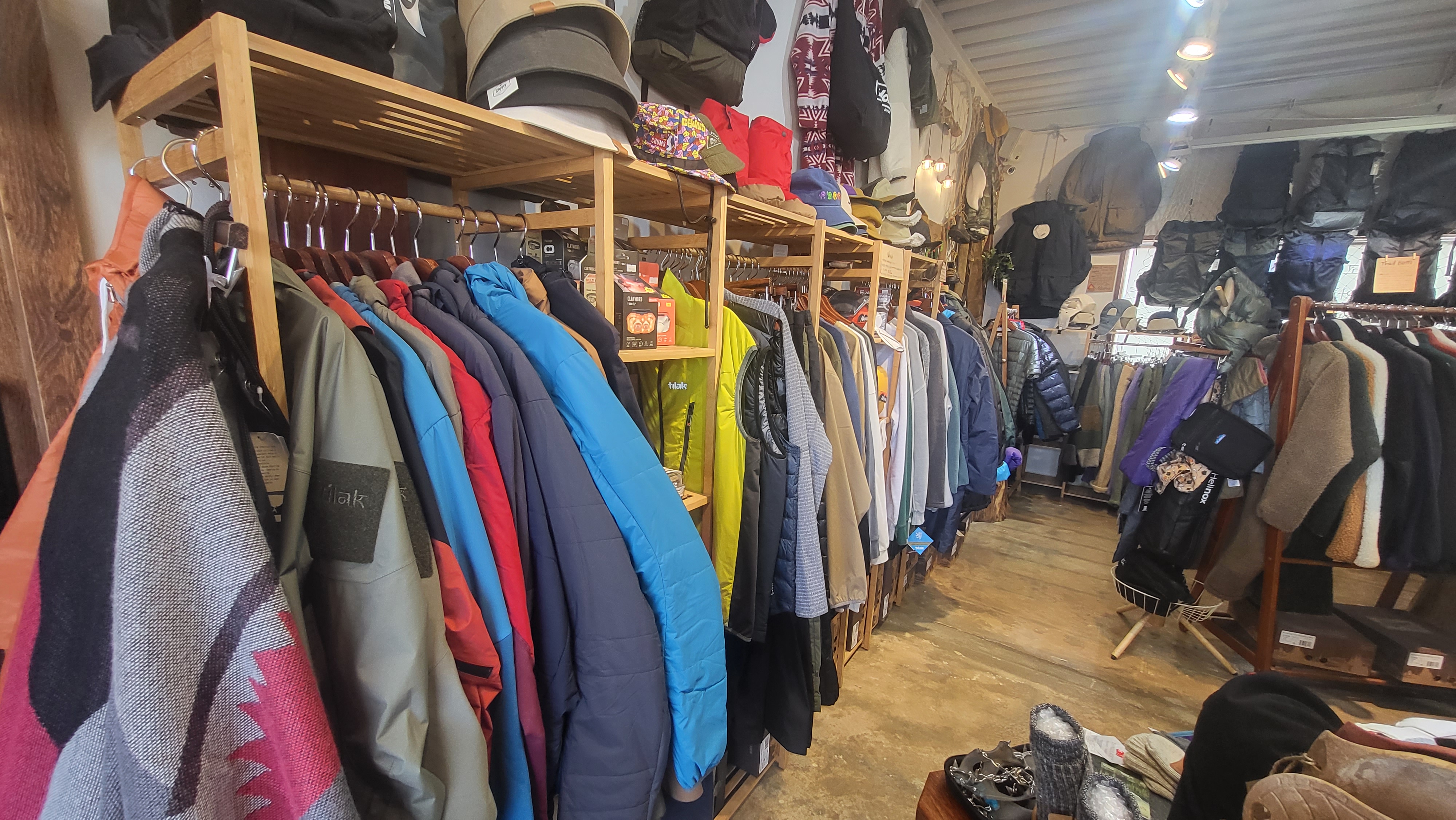 캠핑이나 등산용으로 적합한 의류제품과 모자, 양말 등도 판매중이었다.