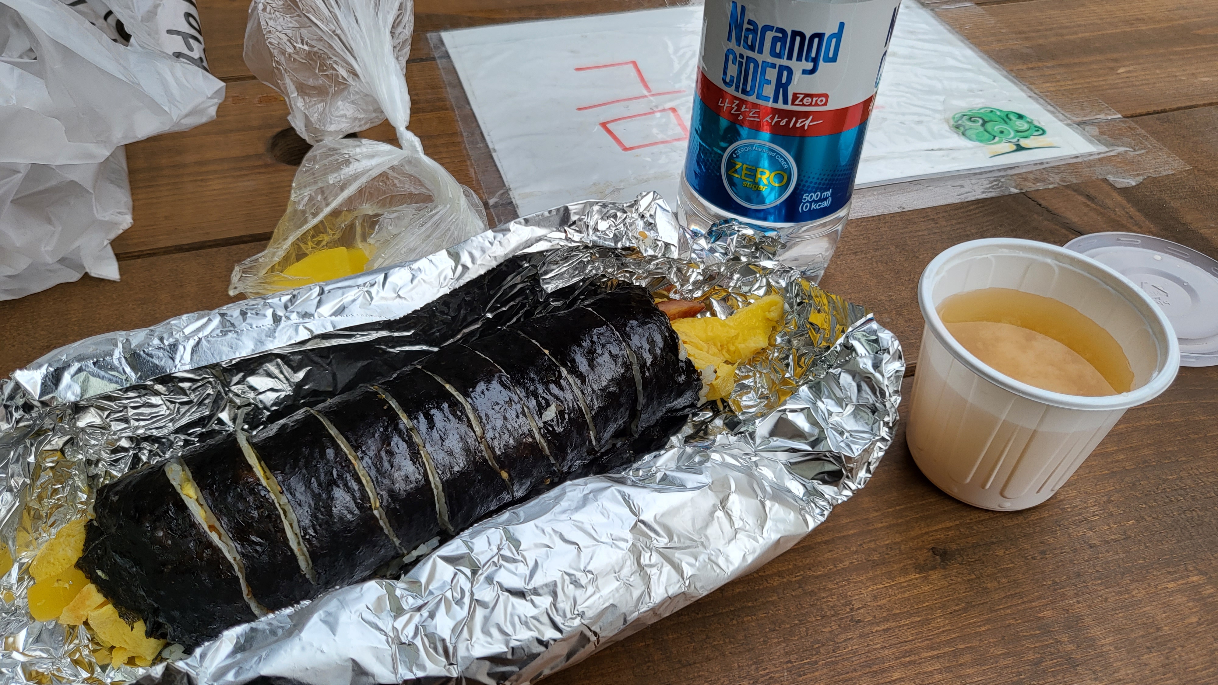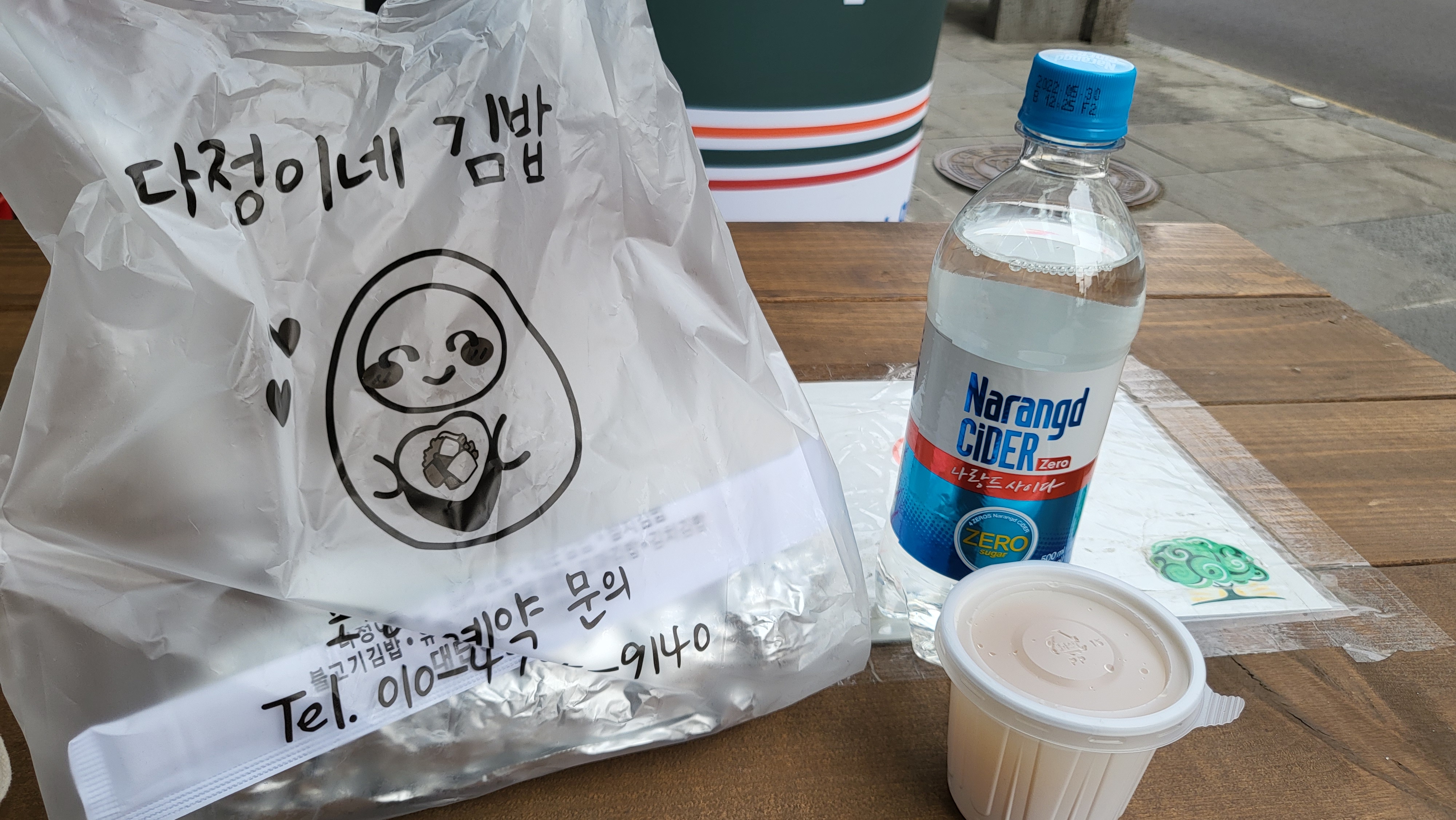 먹을 곳이 마땅치않아 근처 편의점에서 사이다를 하나 사고 앞에 앉아 함께 먹었다.